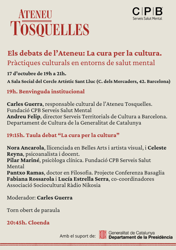 Us convidem a assistir al proper debat de l'Ateneu Tosquelles en què parlarem de les pràctiques culturals en entorns de salut mental. El 17 d'octubre, de 19h a 21h, a la Sala social del Cercle Cívic Sant Lluc (C. de Mercaders, 42. Barcelona)